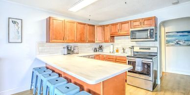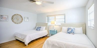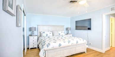 The master bedroom is equipped with a King size bed. Walking through the master, you will find a guest room with two queen beds. The home has 2 bathrooms, one with a standard shower and the other with a shower/tub combo. The living room is newly upgraded with all-new furniture including a pull-out sofa bed and a brand-new large-screen TV.